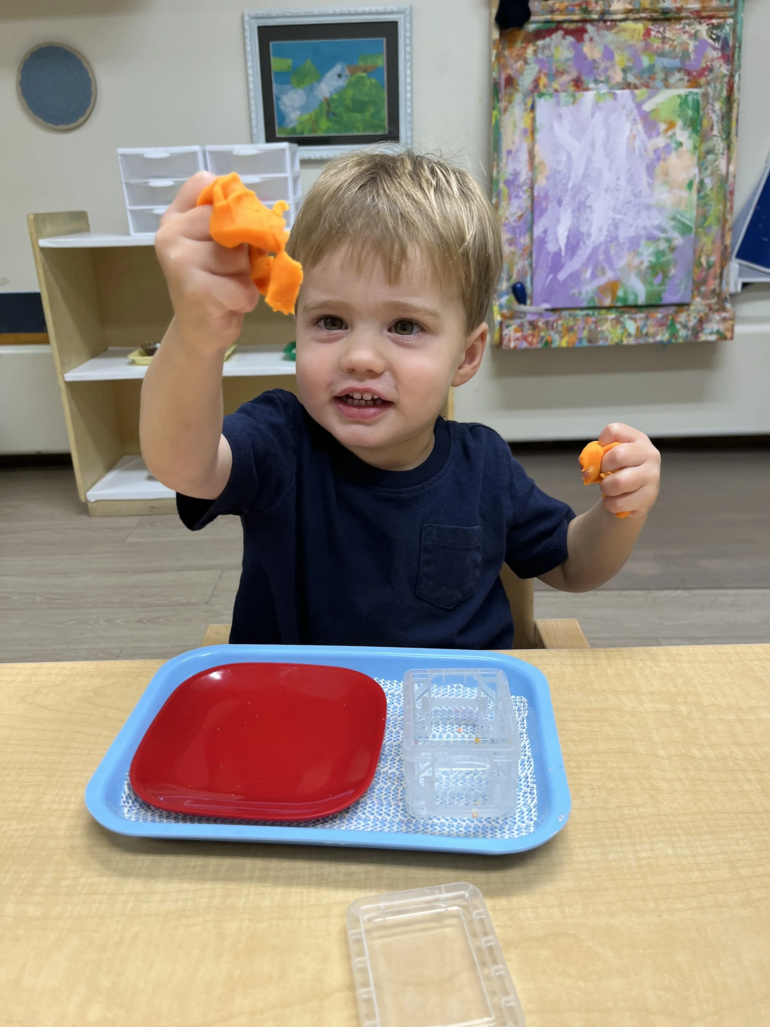 The Toddler program begins and ends with outdoor play! During the work cycle, students are given opportunities to explore independently, participate in group and individual lessons, and engage with their peers.